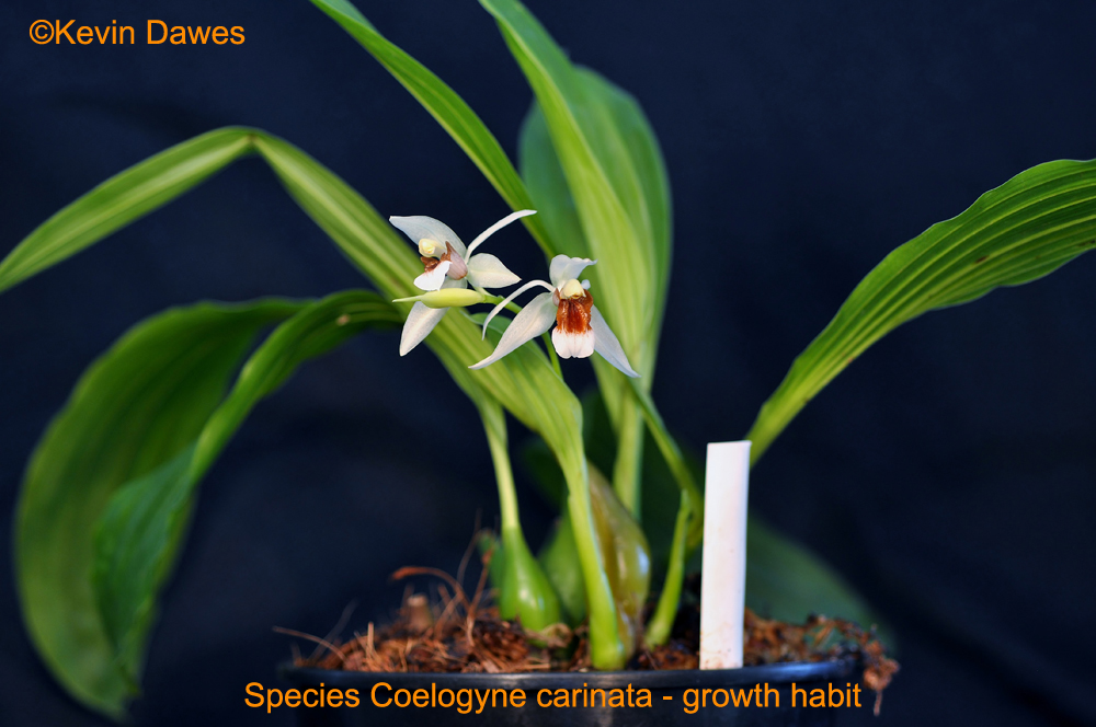 The vast majority of Coelogyne carinata plants sold in Australia are mis-labeled as Coelogyne fragrans and from looking a photos on the web, this confusion seems to be world-wide. The main identifying factor is the colour of the column. Coelogyne carinata's column is basically entirely green while Coelogyne fragrans has orange to brown on the top (hood) of the column - often very bright.