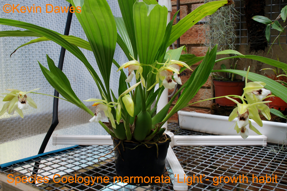 Cultivation Suggestions: Coelogyne marmorata is from the Philippines to around a 1000 metres so it prefers warm moist conditions with high humidity, lots of water and completely frost free.