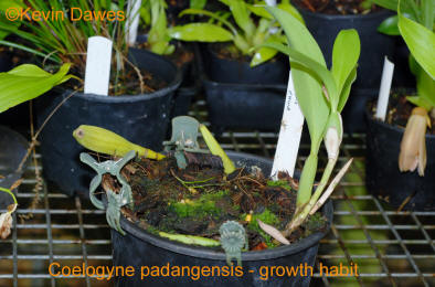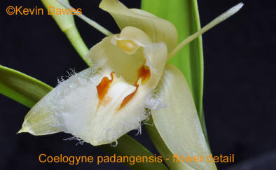 Dr Barbara Gravendeel, a Dutch expert, suggests that this Coelogyne, along with a number of others should all be renamed as Coelogyne fimbriata. On my page for Coelogyne ovalis is an image of this plant labeled as Coelogyne ovalis 'China'. I strongly feel that this plant is incorrectly labeled. I think it is Coelogyne pandangensis which in turn should be relabeled as Coelogyne fimbriata according to Dr Gravendeel. You (like me) should be totally confused by now! Without any scientific backup, I have placed the images on this page in the context of all of this confusion. One day I may have to re-label it as Coelogyne fimbriata.